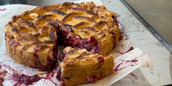 Описание: Пирог из слоёного теста с сочной ягодной начинкой и нежным заварным кремом.📌 Нужно:🔻🔻🔻 Для вишнёвой начинки:🔹 Вишня – 700 г (вес без косточек)🔹 Обычный сахар – 120 г🔹 Ванильный сахар – 10 г🔹 Соль – 1 щепотка🔹 Крахмал – 30 г🔹 Лимонный сок – 25 г🔻🔻🔻 Для крема:🔹 Молоко – 480 г🔹 Обычный сахар – 120 г🔹 Ванильный сахар – 6 г🔹 Желтки – 100 г🔹 Крахмал – 45 г🔹 Сливочное масло – 30 г🔻🔻🔻 Для теста и смазывания:🔹 Слоёное бездрожжевое тесто – 500 г🔹 Яйцо – 1 штука🔹 Молоко или сливки – 25 г🔹 Сахар – 1 ч. ложка📌 Готовка:🔷 Выложите в кастрюлю вишню, оба вида сахара и соль. Доведите до кипения.🔷 Смешайте крахмал с лимонным соком и добавьте в кипящую вишню, активно перемешивая.🔷 Остудите ягодную начинку до комнатной температуры.🔷 Тем временем займитесь кремом. В сотейнике вскипятите молоко и два вида сахара.🔷 В миске соедините желтки и крахмал. Влейте часть горячего молока и перемешайте до однородности.🔷 Влейте оставшееся молоко, тщательно перемешайте.🔷 Верните смесь обратно в сотейник, поставьте на огонь и доведите до загустения, постоянно помешивая.🔷 Добавьте масло, перемешайте и тоже остудите крем до комнатной температуры.🔷 Раскатайте большую часть теста в пласт толщиной 3 мм. Переложите в кондитерское кольцо диаметром 24 см, формируя бортики.🔷 Выложите вишнёвую начинку, сверху распределите заварной крем.🔷 Сделайте решётку из полосок теста. Взбейте яйцо с молоком или сливками, смажьте тесто. Присыпьте сахаром.🔷 Выпекайте пирог 20 минут в духовке, разогретой до 200 ℃.