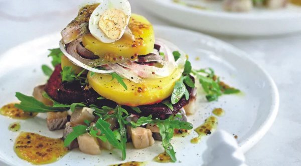 Описание: ✅ Башенки со свеклой и сельдьюЗакуска / Салат. Для праздничного стола.📌 Нужно (на 4 порции):🔹 2 филе слабосолёной сельди🔹 4 перепелиных яйца🔹 4 ст.л. майонеза🔹 2 картофелины🔹 2 свеклы🔹 1 средняя луковица🔹 50 г рукколы🔹 соль🔹 свежемолотый чёрный перец📌 Готовка:🔷 Картофель и свеклу вымойте и, не очищая, сварите до готовности.🔷 Отварите в течение 5 мин перепелиные яйца. Дайте остыть. Очистите и разрежьте на половинки.🔷 Филе слабосолёной сельди нарежьте небольшими кубиками.🔷 Лук нарежьте тонкими кольцами, а очищенные свеклу и картофель – кружочками.🔷 На порционные тарелки выложите подушку из сельди, немного смажьте майонезом и выложите лук, потом – рукколу, а затем, чередуя слои из картофеля, свеклы и рукколы, соберите башенки, скрепляя каждую по центру майонезом. Слои посолите и поперчите по вкусу.🔷 Завершите башенку кружочком свеклы и украсьте разрезанным пополам перепелиным яйцом.