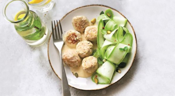 Описание: Второе блюдо. На обед.📌 НУЖНО (на 4 порции):🔹 500 г свиного фарша🔹 500 г куриного фарша🔹 250 мл куриного бульона🔹 180 мл сливок жирностью 10%🔹 60 г сливочного масла🔹 2 кабачка🔹 1 яйцо🔹 1 ст. л. горчицы🔹 1 ст. л. оливкового масла🔹 соль – по вкусу🔹 молотый чёрный перец – по вкусу🔹 зелень - для подачи📌 ГОТОВКА:🔷 В миске смешайте свиной и куриный фарш.🔷 Помойте 1 кабачок и, не очищая от кожуры, натрите на средней тёрке.🔷 К натёртому кабачку добавьте яйцо, посолите. Добавьте фарш и тщательно перемешайте.🔷 В миске смешайте бульон, горчицу и сливки.🔷 Разогрейте сковороду со сливочным маслом, выложите в неё фрикадельки и жарьте по 3-5 мин с каждой стороны.🔷 Влейте бульонную смесь на сковороду, доведите до кипения. Уменьшите огонь и готовьте ещё 5-10 мин до загустения.🔷 Очистите от кожуры второй кабачок. С помощью овощечистки снимите с него спирали. Выложите их на блюдо, сбрызните оливковым маслом, посолите и поперчите. Украсьте зеленью и подавайте с фрикадельками.