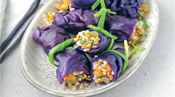 Описание: Лёгкие и яркие рулетики из красной капусты с начинкой из булгура придутся по вкусу даже вегетарианцам. Если ваши гости веганы, то есть совсем не употребляют продуктов животного происхождения, эти рулетики подойдут и для них. Просто сделайте два вида соуса – на обычном греческом йогурте и на растительном аналоге, сейчас такие несложно найти в магазинах. Сочетание булгура, изюма, лимонной цедры и грецких орехов придаст начинке восточного колорита. Вы можете добавить к ним щепотку корицы, мускатного ореха или молотой гвоздики, чтобы усилить эффект. 📌 НУЖНО (на 4 порции):🔹 8 больших листьев краснокочанной капусты🔹 200 г отваренного булгура🔹 50 г грецких орехов🔹 50 г изюма🔹 4 ст. л. натурального греческого йогурта🔹 2 веточки свежей мяты🔹 1 лимон🔹 несколько перьев зелёного лука🔹 соль, молотый чёрный перец📌 ГОТОВКА:🔷 Залейте изюм кипятком и оставьте на 5 мин. Слейте воду, изюм обсушите. Орехи обжарьте на сковороде без масла и порубите. Отделите от стеблей листья мяты и мелко нарежьте. Вымойте лимон щёткой и снимите тёркой 0,5 ч. л. цедры. Выжмите 1 ст. л. сока.🔷 Положите листья капусты в кипяток и оставьте на 10 мин. Слейте воду, листья обдайте холодной водой и тщательно обсушите. Вырежьте утолщения.🔷 Соедините булгур с изюмом, орехами и половиной рубленой мяты. Добавьте цедру, лимонный сок, соль и перец, перемешайте.🔷 Выкладывайте смесь на капустные листья, сворачивайте рулетики и перевязывайте их перьями зелёного лука.🔷 Смешайте йогурт с оставшейся мятой, посолите и поперчите. Перемешайте и подавайте с рулетиками.🔥 КСТАТИ. Булгур – крупа из дроблёной пшеницы, популярная на Кавказе, Балканах и в странах Ближнего Востока.🔥 НА ЗАМЕТКУ. Как сварить булгур? Можно просто залить кипятком в пропорции: 1 часть булгура на 2 части воды – и оставить в плотно закрытой посуде. Он сам себя приготовит и получится рассыпчатым и с лёгкой, приятной «твердинкой» внутри. Хотите, чтобы ореховый вкус булгура раскрылся полнее, предварительно обжарьте сухую крупу 5 минут на сливочном масле, а потом варите или запаривайте.