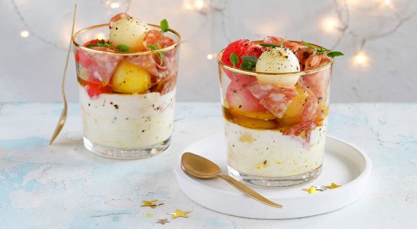 Описание: 🥣 Салат-закуска из арбуза, дыни, моцареллы и салями✅ НУЖНО:🔹 200 г дыни с плотной мякотью🔹 200 г мякоти арбуза🔹 200 г мини-моцареллы🔹 100 г тонких ломтиков салями🔹 120 г творожного сыра🔹 50 мл жирных сливок🔹 3 веточки базилика🔹 4 ст. л. оливкового масла🔹 1 ст. л. лимонного сока🔹 1 ч. л. мёда🔹 соль🔹 молотый чёрный перец✅ ГОТОВКА:🔷 Мякоть дыни и арбуза при помощи ложки-нуазетки нарежьте шариками. Мелкие листочки базилика отложите, крупные измельчите. Ломтики салями разрежьте пополам.🔷 Для заправки смешайте оливковое масло с лимонным соком, медом, солью и перцем и взбейте. Добавьте измельчённый базилик.🔷 Творожный сыр взбейте со сливками, приправьте солью и перцем и разложите по стаканчикам.🔷 На творожный сыр выложите шарики моцареллы, арбуза, дыни, свёрнутые вдвое половинки салями. Полейте заправкой, украсьте базиликом и поперчите.🔥 НА ЗАМЕТКУ. Если ложки-нуазетки в хозяйстве не нашлось, нарежьте дыню и арбуз кубиками одинакового размера, примерно по размеру шариков моцареллы.🔥 КСТАТИ. Подать такой салат можно не только в стаканах, но и на плоском блюде. В этом случае возьмите более крупные шарики моцареллы и нарежьте сыр, арбуз и дыню одинаковыми плоскими ломтиками, а затем выложите на тарелку немного внахлёст, чередуя с ломтиками салями, как при подаче салата Капрезе.