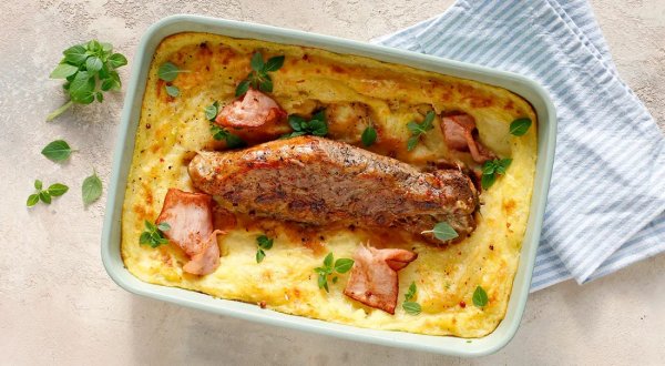 Описание: 🥣 Картофельная запеканка со свиной вырезкой✅ НУЖНО:🔹 800 г картофеля🔹 400 г свиной вырезки🔹 4 ломтика ветчины🔹 40 г твердого сыра🔹 2-3 веточки базилика🔹 1 ст. л. оливкового масла🔹 соль по вкусу🔹 перец чёрный молотый по вкусу🔹 масло растительное для смазывания формы✅ ГОТОВКА:🔷 Разогрейте духовку до 220 °C. Смажьте растительным маслом жаростойкую форму. Натрите сыр. Отделите от стеблей листья базилика.🔷 Очистите картофель и нарежьте кубиками со стороной 3 см. Залейте картофель горячей водой, посолите и варите на среднем огне под крышкой 12-15 мин. Слейте отвар, картофель разомните, добавьте половину тёртого сыра и 1 ст. л. оливкового масла и перемешайте. Выложите в форму и разровняйте.🔷 Натрите свинину солью и перцем. В сковороде разогрейте 2-3 ст. л. оливкового масла и жарьте мясо на среднем огне, часто переворачивая на разные стороны, 10 мин. Переложите в форму с картофелем.🔷 Поместите форму с картофелем и свининой в духовку и запекайте 10 мин. Выньте форму, разложите вокруг свинины ломтики ветчины, посыпьте оставшимся сыром и запекайте ещё 5-7 мин. Посыпьте блюдо молотым перцем и украсьте листочками базилика.🔥 НА ЗАМЕТКУ. Чтобы свиная вырезка с картофельным пюре не потеряла красивый вид, подавайте её на стол прямо в форме. В таком виде блюдо удобно держать в духовке до момента подачи, чтобы картофель не остыл. В холодном виде картофельное пюре менее вкусное.🔥 КСТАТИ. Диетологи обычно не советуют есть мясо с картофелем. Считается, что такое сочетание, особенно со свиной вырезкой – довольно тяжёлая пища. Белки с углеводами действительно плохо сочетаются. Но если вы не едите подобные продукты каждый день и в больших количествах, то ничего страшного не случится. Сделайте блюдо более полезным: добавьте к запечённому картофелю с вырезкой растительной клетчатки в виде свежих овощей.