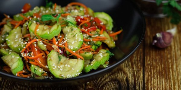 Описание: 🥣 Кимчи из кабачков с морковью✅ Нужно:🔹 Кабачки – 550 г🔹 Соль – по вкусу🔹 Морковь – 1 штука🔹 Лук зелёный – 1 пучок🔹 Чеснок – 1 зубчик🔹 Имбирь свежий – 3 г🔹 Оливковое масло – 2 ст. ложки🔹 Соевый соус – 2 ст. ложки🔹 Рисовый уксус – 1 ч. ложка🔹 Куркума – 2 щепотки🔹 Перец чили сухой – ⅓ ч. ложки🔹 Сахар – 1 ч. ложка🔹 Кунжут – 1 ч. ложка✅ Готовка:➡️ Кабачки нарежьте не очень тонкими кружочками, переложите в миску, посолите, хорошо перемешайте и оставьте на 30 минут.➡️ Морковь натрите на тёрке для корейской моркови, лук измельчите.➡️ Приготовьте заправку. Чеснок пропустите через пресс, имбирь натрите на мелкой тёрке. Смешайте с оливковым маслом, соевым соусом, уксусом, куркумой, перцем и сахаром.➡️ С кабачков слейте выделившуюся жидкость и промойте их, аккуратно отожмите. Затем смешайте с морковью, зелёным луком, заправкой и кунжутом. В идеале дать закуске настояться ещё 1 час в холодильнике, но при желании можно есть сразу.🔥 НА ЗАМЕТКУ. Для этого рецепта лучше использовать молодые кабачки. Но большие тоже подойдут, если вы их очистите и тонко нарежете. Рисовый уксус по желанию можно заменить яблочным.