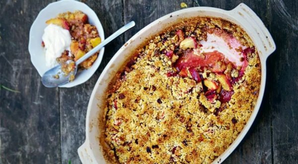 Описание: 🥣 Персиковый крамбл✅ Нужно:🔹 персики - 700 г🔹 сливочное масло - 120 г🔹 мука - 130 г🔹 коричневый сахар - 100 г🔹 ванильный сахар - 2 ст. л.🔹 грецкие орехи - 120 г🔹 разрыхлитель - 1,5 ч. л.🔹 соли - щепотка🔹 сливочное масло для формы👉 Для подачи:🔹 сливки для взбивания - 300 мл🔹 персики - 100 г🔹 сахарной пудры - 3 ст. л.🔹 сок четвертинки среднего лимона✅ Готовка🔵 Чтобы приготовить персиковый крамбл, измельчите грецкие орехи в крошку. Смешайте муку, коричневый сахар, разрыхлитель и соль. Положите нарезанное кусочками масло и порубите в крошку. Добавьте грецкие орехи.🔵 Щедро смажьте форму маслом. Разрежьте персики на 6 частей, удаляя косточки. Выложите в форму, посыпьте ванильным сахаром. Разогрейте духовку до 190 °С. Посыпьте персики тестом и поставьте в духовку на 30 мин.🔵 Взбейте холодные сливки в пену. Персики для подачи ошпарьте, снимите кожицу, мякоть с сахарной пудрой и лимонным соком взбейте блендером в пюре, смешайте со сливками.🔵 Крамбл разложите по мисочкам, сверху выложите сливки и подавайте.🔥 НА ЗАМЕТКУ. Если вам персики кажутся слишком сладкими или вы их просто не очень любите, замените их нектаринами или жёлтыми сливами. Большие плотные абрикосы тоже подойдут для такого фруктового пирога.🔥 КСТАТИ. Английский насыпной пирог крамбл можно делать с любыми сезонными фруктами и ягодами, в том числе с замороженными. Персики в десертах и пирогах, например, отлично сочетаются с малиной или смородиной.