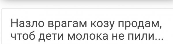 Название: Назло врагам козу продам - чтоб дети молока не пили Описание: О говнистом человеке, который ради того, чтобы подпортить жизнь другим, готов нанести ущерб даже сам себе. Добавлен: 10 ноя в 11:33