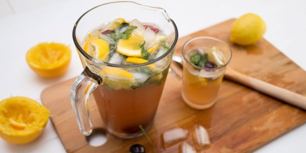 Описание: 🥣 Вишнёвый лимонад с апельсином и мятой✅ Нужно:🔹 Крупный лимон – 1 штука🔹 Крупный апельсин – 2 штуки🔹 Вишнёвый сироп – 100 мл🔹 Веточки мяты – 3-4 штуки🔹 Ягоды вишни или черешни – 1 горстка🔹 Лёд – 10-15 кубиков🔹 Газированная вода – 1 л✅ Готовка🔵 Помойте лимон и апельсины. Половину апельсина и ¼ лимона нарежьте ломтиками.🔵 Из оставшихся цитрусовых выжмите сок.🔥 Если вы не используете соковыжималку, сделайте несколько разрезов в мякоти. Так сок будет выдавливаться легче.🔵 Влейте в кувшин сок и 100 мл вишнёвого сиропа, добавьте дольки лимона и апельсина. Не доверяете магазинному сиропу — используйте вишнёвое варенье.🔵 Немного помните в ладонях листья мяты, некоторые листочки можно порвать. Добавьте мяту к соку и сиропу.🔵 Положите в кувшин половинки ягод вишни или черешни.🔵 Затем добавьте лёд. Кубики должны заполнить половину кувшина.🔵 Остальную половину залейте газированной водой.🔵 Напиток получается с приятным кислым вкусом.🔥 Если вам не хватит сладости, можно дополнительно добавить сироп.