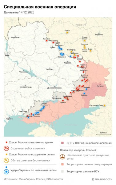 Описание: Спецоперация. Обстановка и главные события на 14 декабря.▪️ ВС России освободили Варваровку в Запорожской области, сообщило Минобороны РФ.▪️ Всего ВСУ за сутки потеряли в зоне СВО порядка 1450 военнослужащих, следует из данных сводки Минобороны РФ.▪️ Российская группировка войск "Центр" продолжает уничтожение формирований ВСУ, окружённых в Димитрове, зачистку Гришино и Светлого в ДНР, сообщили в Минобороны РФ.▪️ Вклад украинцев и европейцев в документы по украинскому урегулированию вряд ли будет конструктивным, заявил Ушаков.▪️ По словам Пескова, заход на территорию Украины специалистов НАТО стало триггером для начала СВО▪️ Отступающие украинские группы не в состоянии выполнять приказы киевского командования об удержании обороны Северска и его пригорода, рассказал офицер-разведчик группировки войск "Южная".