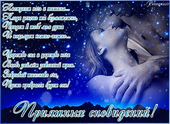 На фоне звёздного неба силуэты влюблённой пары-мужчины и женщины. Наступит ночь и тишина... Когда уснешь ты безмятежно, Придет к тебе моя душа И поцелует нежно-нежно...