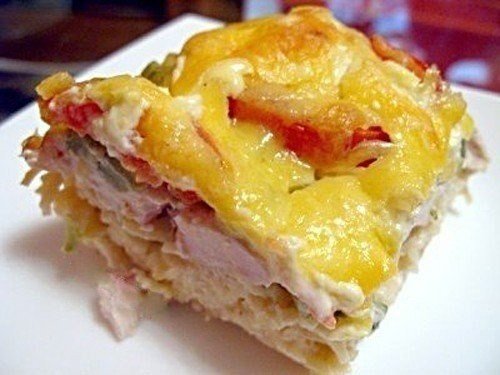 Описание: «Макароша». Потрясающе вкусноИнгредиенты:3-4 яйца1 стакан сливок150 гр сырасоль, перецспагетти3-4 филе курицы4-6 маринованных огурца304 помидорамайонезПриготовление:1. Взбиваем 3-4 яйца со стаканом сливок и 150 гр тёртого сыра. Солим и перчим.2. Берём пачку отваренных спагетти и перемешиваем их с яичной массой.3. Выкладываем в смазанную форму.4. На них кладем смесь из сырой курочки (3-4 филе) и маринованных огурцов (4-6 шт). Солим и перчим.5. Потом помидоры (3-4) кружочками и сеточку из майонеза.6. Последний слой - тёртый сыр.7. А теперь в духовку на 200 градусов пока сыр не станет румяно-золотистым!
