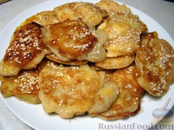Описание: 3-4 яблока1-2яйца1/2-1стол.л.карт.крахмал1-3стол.л.сахарсода или разрыхлитель Мука(тесто по густоте,как на обычные оладьи)Масло для жаркиЯблоки очистить,потереть на крупной терке,посыпать крахмалом,добавить остальные продукты по рецепту,замесить тесто.Жарить как обычные оладьи.p.s. Фото из инета;на нем оладьи посыпаны кунжутом.