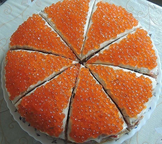 Описание: Закусочный торт из морепродуктов.Смесь для блинов: понадобится 3 яйца,4-5 ст. л. сахара, чуточку соли, 1/2 ст. молока, всю эту массу взбить и добавить 1 ст. муки, хорошо перемешать так чтобы не было комочков и в конце добавить 5 ст. л. растительного масла, смесь должнаполучится как на оладьи и можно даже слегка погуще. Выпечь 5 блинов потолще чем обычные на раскаленной сковороде с двух сторон и чуточку растительном масле в начале.Начинка:200-250 гр. плавленного сыра со вкусом лосося или с зеленью(которыйхорошо мажется) и 150 гр. майонеза, все хорошо перемешать, этой массойсмазать все блины, а теперь слои:1) кальмары в собственном соку или отварные (мелко порезать) сверху посыпать немножко зеленого лучка2) креветки отварные и порезанные и сверху зелень петрушки и укропа3) крабовые палочки порезанные кружочками и сверху немножко зеленого лучка4) тонко порезанная семга или форель и сверху зелень петрушки и укропа5) когда все слои готовы, укладываем последний слой и смазываем егоприготовленной смесью из плавленного сыра с майонезом, затем разрезаемна порционки как торт и уже потом выкладываем красную икру (чтобы она непотеряла внешний вид и не растеклась когда режут торт).Приятного аппетита!