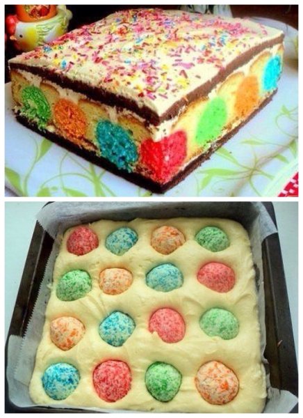 Описание: Пляцок пасхальный «Писанки»!ИнгредиентыМасло сливочное — 200 г.Сахар — 1 стаканЯйца — 4 шт.Яичный белок - 1 шт.Сметана — 150 г.Мука — 2 стаканаРазрыхлитель теста — 2 ч. ложкиКакао — 3 ст. ложкиМолоко — 3 ст. ложкиАроматизатор "ром" — 2-3 каплиДля кокосовых шариков:Творог — 300 г.Яичный желток — 1 шт.Сахар — 3 ст. ложкиМанка — 1,5 ст. ложкиКокосовая стружка (цветная) — 80 г.Ванильный сахар — 10 г.Для крема:Сметана домашняя — 250 мл.Кефир — 150 г.Сахарная пудра — 2 ст. ложкиКондитерская посыпка — 2 ст. ложкиСпособ приготовленияШаг 1 Для кокосовых шариков: смешать творог, сахар, ванильный сахар, манку и желток.Шаг 2 Разделить творожную массу на 4 части. В каждую порцию творожной массы вмешать по отдельности кокосовую стружку разного цвета.Шаг 3 Скатать из творожно-кокосовой массы шарики, выложить в лоток и поместить в морозилку на 30 минут.Шаг 4 Далее размягченное масло растереть с сахаром до бела. Не переставая взбивать, добавить по одному яйца и белок, сметану.Шаг 5 Добавить в несколько приемов муку, смешанную с разрыхлителем теста. Тесто разделить на одну треть и две трети.Шаг 6 В одну треть теста добавить какао и молоко, размешать. Форму размером 20х20см застелить бумагой для выпечки, вылить тесто. Выпекать при температуре 190 градусов 25-30 минут. Готовый корж остудить и разрезать вдоль на 2 пласта.Шаг 7 Светлую часть теста вылить в форму, подготовленную аналогичным способом. Выложить разноцветные кокосовые шарики, чередуя их. У меня поместилось по 4 шарика разного цвета. Выпекать при t 190 градусов 30-35 минут. Готовый пласт остудить на решетке.Шаг 8 Для крема: в охлажденную сметану добавить кефир, сахарную пудру и взбить миксером до загустения.Шаг 9 Сборка пляцка: шоколадный корж, крем, светлый корж, крем, шоколадный корж. Сверху смазать оставшимся кремом и поставить пляцок в холодильник на 3-4 часа (лучше на ночь).Шаг 10 Готовый пляцок посыпать кондитерской присыпкой для пасок, обрезать края.Приятного аппетита!