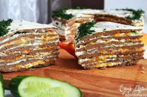 Описание: Печеночный торт «Освежающий»Ингредиенты:Куриная печень – 800 гМорковь – 3 шт.Лук репчатый – 3 шт.Свежий огурец – 1 шт.Сметана – 200 гМайонез домашний – 150 гЧеснок – 0,5 головкиУкроп – 1 пучекПшеничная мука – 3 ст. л.Соль – 1 ч. л.Лавровый лист – 3 шт.Яйцо – 3 шт.Приготовление:1. Для начала очистим морковь, промоем (у меня морковки маленькие, поэтому брала 5 шт, если брать среднего размера, трех будет достаточно). 2. Очищенную морковь натираем на крупной терке.3. Лук также очищаемся и мелко рубим.4. После чего обжариваем морковь и лук на растительном масле до слегка золотистого цвета.5. Выключаем огонь, к зажарке бросаем лавровый лист, накрываем крышкой. Пусть хорошенько пропитается ароматом специи! Остужаем. 6. Промываем печень под проточной водой, даем стечь жидкости. После чего обрезаем прожилки.7. Измельчаем с помощью блендера. Добавляем муку, яйца, 2 ст. л. сметаны и соль. Тесто должно получится как на оладьи,допускается немного гуще.8. На разогретой и смазанной растительным маслом сковородке выпекаем коржи (это самый долгий и ювелирный процесс, т.к. стараемся, чтобы края были ровными).9. На сковородке 22 см у меня получилось 8 коржей. Даем им время для полного остывания.10. Тем временем смешиваем сметану, майонез, порубленную зелень и чеснок.11. Собираем наш тортик: Сперва на корж идет сметанно-майонезный соус (~1.5 ст. л.).12. Затем зажаренные морковка с луком (если много растительного масла, рекомендую предварительно отжать прожаренные овощи). Потом снова корж.13. И на соус выкладываем огурец (предварительно натереть его на крупной терке). Так чередуем начинку.14. Получается вот такой тортик, украшаем по желанию и по наличию фантазии :)Автор рецепта: Юлия Высоцкая
