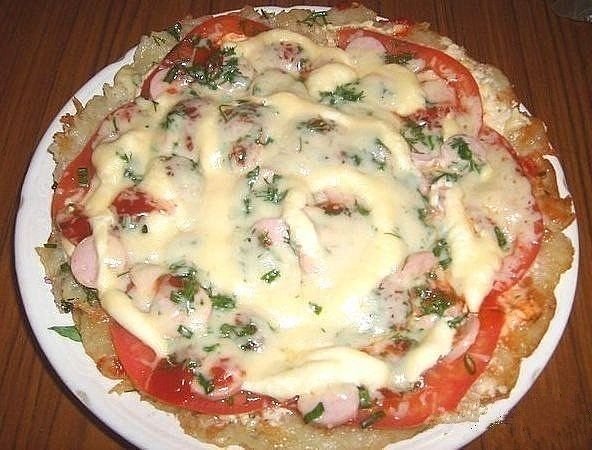 Описание: КАРТОФЕЛЬНАЯ ПИЦЦА.Ингредиенты:● 4 больших картофелины● 2 помидора● 100-150 г колбасы или сосисок или куриного мяса● майонез● 2 ст.л. муки● соль перец по вкусу, зелень● сыр 50-100 гр.Приготовление:1. Картофель натереть на крупной терке, добавить яйцо, щепотку соли, перец, муку, все тщательно перемешать.2. Полученную смесь выложить в форме большого блина на сковороду с растительным маслом и жарить с одной стороны 10 минут.3. Блин перевернуть на другую сторону, смазать майонезом выложить помидор, колбасу, зелень, сверху посыпать сыром, накрыть крышкой и жарить еще 10 минут.Приятного аппетита! :ням
