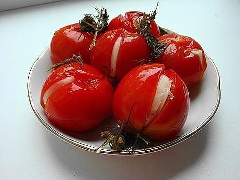 Описание: От таких малосольных помидоров с чесночком никто не откажется. Готовятся очень просто и быстро, вкус - изумительный. Ставьте "Класс" и сохраняйте рецепт у себя на страничке!Для малосольных помидор нужно:На 1 кг помидоров среднего размера1.5 л воды4 ст.л. соли2 ст.л. сахара1.5 ч.л. уксуса5 веточек укропа1 корень петрушки3 листа лаврушки2 листа смородины4 листика вишни6 горошин чёрного перца1/3 ч.л. семян горчицы1/3 ч.л. паприки2 гвоздички6 – 8 зуб. чеснока. В принципе, если что-то из предложенного объема специй у вас отсутствует не страшно, можно делать и не с полным набором.Приготовление:Берем помидоры, моем и надрезаем немного сбоку, вставляем резаные зубчики чеснока. Укладываем помидоры в кастрюли или банку пересыпая солью, сахаром, специями и приправами.Воду кипятим. Выстаиваем её 1 – 2 мин. и заливаем помидоры. Теперь добавляем уксус и накрываем крышкой. После того как кастрюлька или банка полностью остынет, её нужно убрать в холодильник. Через 10 – 12 часов наши малосольные помидоры уже готовы. В этом рассоле их можно держать сколько угодно, просто через недельку (если останутся) это уже будут не малосольные, а соленые помидоры. Что тоже очень вкусно!