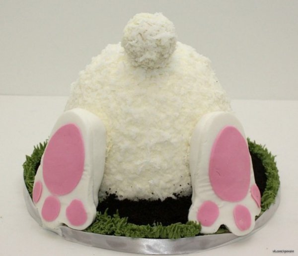 Описание: Торт "Кролик"Перед тем, как готовить и украшать торт «Кролик», нужно подготовить все необходимые ингредиенты. Основой для торта могут послужить как обычные бисквитные коржи, не требующие приготовления, которые можно купить в любом супермаркете, так и самостоятельно приготовленные бисквитные коржи.Заготовку для будущего торта необходимо сделать полукруглой (чтобы она напоминала холмик земли) — для этого придется обрезать коржи соответствующим образом и покрыть глазурью.Ингредиенты:Немного мягкой карамели или кулинарной мастики двух цветовПол-стакана кокосовой стружкиМаргарин либо сметана, сахар и зеленый краситель для кремаРастопленный белый шоколадТертый темный шоколадПриготовление:Пока глазурь на коржах застывает, займемся изготовлением кроличьего хвостика. В принципе, можно ограничиться конфетами «Рафаэлло», но гораздо более реалистичным и вкусным наш «хвостик» получится, если сделать его своими руками. Для этого нам потребуется маленький шарик из теста (его, конечно же, нужно предварительно испечь в духовке) и жидкий белый шоколад.Окунаем заготовку «хвостика» в шоколад, оставляем на несколько секунд, чтобы излишки шоколада стекли обратно в емкость, а затем окунаем получившийся шоколадный шарик в кокосовую стружку.Оставляем получившийся «хвостик» пасхального кролика застывать и приступаем к изготовлению кроличьих лапок — для этого нам потребуется мягкая карамель или мастика двух цветов, розового и белого. Раскатываем розовую мастику тонким слоем, вырезаем несколько маленьких кругов и накладываем на белые кусочки в форме кроличьих лапок.Теперь переходим к завершению нашей пасхальной композиции. Нижний корж смазываем зеленым сливочным кремом (для приготовления которого смешиваем сахар, маргарин либо сметану и немного зеленого красителя) и посыпаем с нескольких сторон тертым темным шоколадом.Выкладываем на нижний корж верхнюю часть нашего пасхального торта, посыпаем со всех сторон остатками кокосовой стружки.К почти готовому торту осталось прилепить сделанные заранее кроличьи «лапки» и «хвостик». Чтобы «хвостик» держался как можно лучше, его можно закрепить на деревянную палочку, а не просто прилепить к верхнему коржу торта. Вот и все — торт «Кролик» готов!
