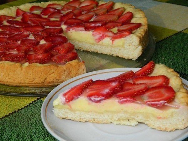 Описание: Пирог с клубникой и белым шоколадом.Масло сливочное (+ масло для формы) — 100 гСахар — 40 гБелок яичный — 2 штЖелток яичный — 2 штМука (+ мука для рабочего стола) — 200 гСливки (жирные) — 200 млШоколад белый — 200 гЛимон (сок) — 1 ст. л.Клубника — 400 гЖеле — 1 упак.Из муки, масла, белков и сахара замесить однородное тесто и поставить на полчаса в холодильникДля начинки: разогреть сливки. Шоколад измельчить и растопить в сливках. Дать массе остыть и ввести желтки. Влить сок лимона. Разъемную форму диаметром 24см смазать маслом. Тесто раскатать в пласт и выложить в форму, сделав бортики высотой 2-3 см. На тесто вылить сливочно-шоколадную массу и выпекать в духовке при 175* в течение 25мин.Начинка должна оставаться мягкой! Дать остыть и поставить в холодильник на 2 часа.Желе для торта приготовить в соответствии с указаниями на упаковке. Ягоды выложить на торт и покрыть желе.Приятного аппетита! :ням