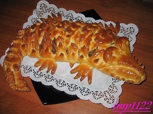Описание: Мясной пирог "Крокодил"Продукты:для теста:1 пакетик сухих дрожжей (11 грамм)2 ст. ложки сахара1 щепотка соли1 яйцо250 мл. теплого молока6 ст. ложек растительного масла~ 500 гр. мукидля начинки:1 маленький велок капусты2-3 луковицы500 гр. мясного фаршасоль, перецПриготовление:1.В большой чашке смешиваем все сразу: яйцо, дрожжи, молоко, растительное масло, соль и сахар. Отмеряем примерно 500 гр. муки и замешиваем тесто, подсыпая муку постепенно, до тех пор пока оно не перестанет прилипать к рукам. Формируем шар, накрываем салфеткой и отправляем в тепло на расстойку.А этим временем занимаемся начинкой: пережариваем все по отдельности, капусту, лук и фарш. Солим и перчим по вкусу.Раскатываем прямоугольный пласт теста, обрезаем края, чтобы было ровненько, а остатки теста нам еще пригодятся.. Переносим тесто на противень застеленный пергаментом, иначе потом это сделать будет трудно. На середину выкладываем начинку.Начиная с углов, делаем надрезы до начинки толщиной около 3-4 см. Складываем их косичкой в нахлест, оставляем только первые и последние.Из верхней части складываем голову, а из нижней- хвост.Формируем ноздри у Крокодила, из обрезков теста лепим лапки и глаза- брови.Делаем клыки с помощью ножниц по краю челюсти, не дорезая до конца.Также ножницами создаем неровности по всему телу.. Выпекаем в духовке при 200 градусах до зарумянивания. За 10 минут до готовности смазываем животное взбитым яйцом.Приятного аппетита!