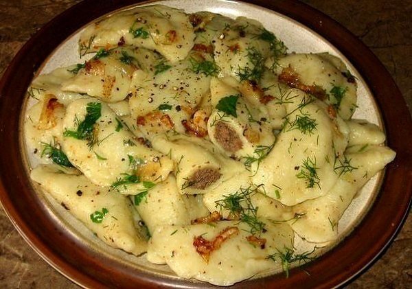 Описание: Картофельные вареники с куриной печенью.Ингредиенты:Для теста:● 4-5 картофелин, сваренных в мундире и очищенных● 1 яйцо● 250-300г муки● сольДля начинки:● 500г куриной печени● 1 небольшая луковица● 60г сливочного масла● соль и перецДля заправки:● 100г сливочного масла● 1 луковица● 1 ст. ложка рубленой зелени● свежемолотый черный перецПриготовление:Картофель пропускаем через мясорубку, смешиваем с яйцом, мукой, солью и замешиваем тесто, которое должно отставать от рук. Накроем его и дадим немного постоять.Для начинки печень очистим от пленок, обжарим на масле с рубленым луком, посолим и поперчим. Пропустим печень через мясорубку.В качестве начинки можно использовать также другие потроха: сердце, желудочки. Вареники можно начинить тушеной капустой, жареным луком со шкварками.Тесто раскатываем до 3мм, стаканом вырезаем кружочки. На кружочки выкладываем начинку и залепляем вареник. Подготовленные вареники варим в большом количестве подсоленного кипятка минуты 3 после всплытия. Откидываем вареники на дуршлаг.Заправляем вареники луком, обжаренным на масле, посыпаем зеленью и перцем.