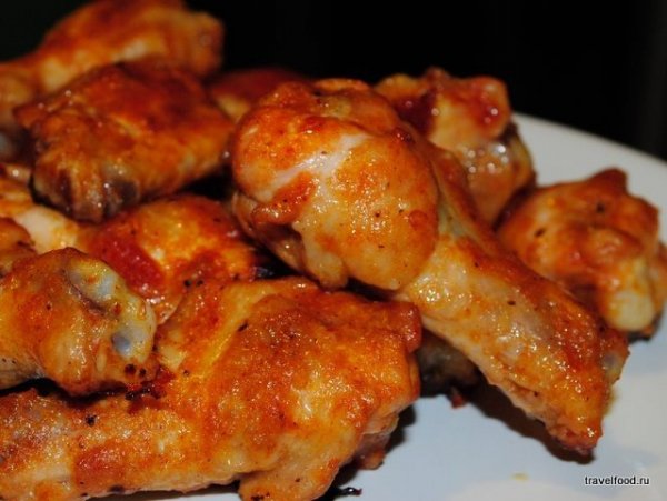 Описание: Куриные крылышки «Бaффало»Ингредиенты на 2–3 порции:Куриные крылья — 900 гСоль — по вкусуПерец черный — по вкусуЧеснок молотый — 1–2 ч. л.Масло сливочное — 30 гТабаско — 1/2 ч. л.Острый чили соус (однородный) — 6–7 ст. л.Томатное пюре — по вкусуВинный уксус — 1 ч. л.Перец чили (молотый) — по вкусуРастительное масло — 1 ст. л.Приготовление:1. Включаем духовку на 210 градусов.2. Куриные крылышки разрезаем на 3 части, для приготовления используем две более толстых части.3. В большой миске смешиваем крылышки с солью, перцем, чесноком (по вкусу) и растительным маслом.4. Перекладываем крылышки на противень и готовим в духовке 15–20 минут.5. В кастрюле смешиваем сливочное масло, острый чили соус (если с частичками, просто процедить), винный уксус, табаско, молотый перец чили и чеснок, можно добавить томатное пюре (готовые измельченные томаты в упаковке).6. На медленном огне, помешивая, растворяем сливочное масло. Не кипятить!7. Достаем крылья и высыпаем их в кастрюлю с соусом.8. Очень хорошо перемешиваем и снова в духовку на 5 минут.9. Перекладываем на общую тарелку.10. Подавать крылышки «Баффало» со стеблем сельдерея и сырным соусом.