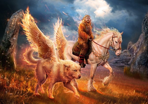 Описание: В древних книгах славян повествуется о том, как Семаргл появился на свет. Сварог ударил магическим молотом о камень Алатырь, высек из него божественные искры, которые разгорелись, и в их пламени стал виден огненный бог Семаргл. Он восседал на златогривом коне серебряной масти. Густой дым стал его знаменем. Где проезжал Семаргл, оставался выжженный след. Таков он был в силе, но чаще выглядел тихим и мирным. Семаргл, Бог огня и Луны, огненных жертвоприношений, дома и очага, хранит семена и посевы. Может оборачиваться священным крылатым волком.