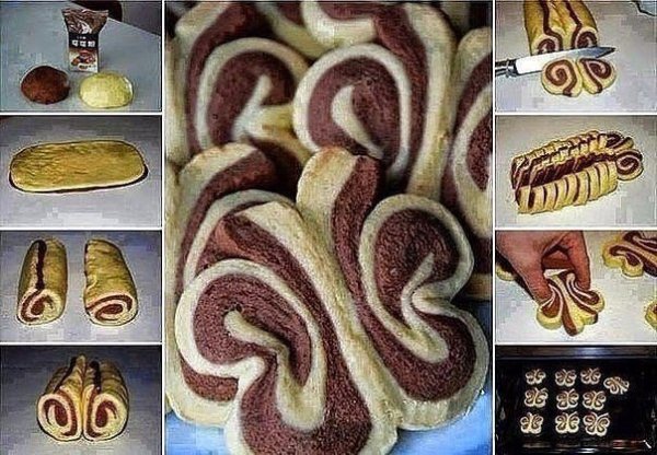 Описание: Печенье бабочки!Посмотрите на эту красоту! Это печенье бабочки не только вкусное, но и очень красивое. Рецепт совершенно простой. Очень интересный способ лепки. Знакомьтесь с рецептом и за готовку.Ингредиенты:мука пшеничная 150 гр. плюс 3-5 ст.л ,разрыхлитель 1/2 ч.л.,крахмал 50 гр.,сахар 125 гр.,масло сливочное мягкое 125 гр.,чуть соли,чуть соды,яйцо,ликёр лимонный 2-3 ч.л.,какао 1 ст.л.,ваниль.Приготовление.Растираем сливочное масло с сахаром,ликёром и яйцом.Подмешиваем смесь из просеянной муки,крахмала,соли,соды и разрыхлителя.Делим тесто на две равные частив одну подмешиваем какао,а в другую-ваниль,подсыпаем в каждую часть по 2-3 ст.л. муки,вымешиваем мягкое тесто.Раскатываем оба теста тонко между плёнкой,накладываем одно на другое,плотно прижимаем(скалкой),делим пласт(30×23 cм.) пополам и скручиваем в тугие рулеты,кладём рулеты плотно друг к другу так,чтобы края загнутого теста образовывали «усики».Убираем тесто в холод,завернув в плёнку.Через полчаса вынимаеми нарезаем поперёк на кусочки шириной около 8 мм.,кладём их на пергамент,придавая форму бабочки-слегка придавливая в центре и расправляя усики.Печем в разогретой духовке до 175 градусов около 12 минут
