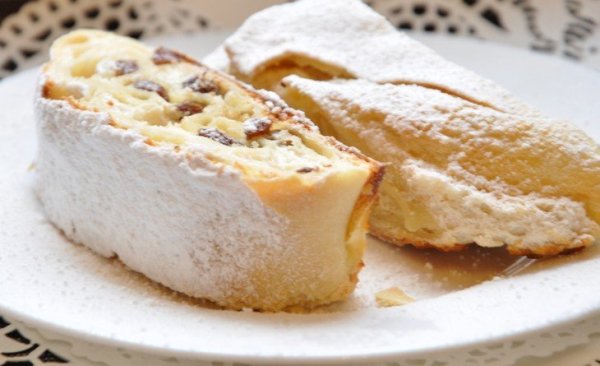 Описание: Ретэш с творогомИнгредиенты:Мука (с высоким содержанием клейковины) — 350 гЯйца среднего размера — 3 шт.Жир растопленный — 75 гТворог — 250 гИзюм — 1/2 стак.Сахар — по вкусуУксусТертые сухари — 50 г (можно заменить мелкой манкой)Сахарная пудра — для посыпкиПриготовление:1. Яйца разделить на желтки и белки.2. Влить в муку 25 г жира, добавить желтки, 2–3 капли уксуса и немного воды (воду добавлять по 1 ст. л. при замешивании, мне понадобилось около 5 ст. л.). Замесить эластичное нелипкое тесто, скатать в шар, смазать тонким слоем жира.3. Подогреть на огне пустую кастрюльку подходящего размера и накрыть тесто. Оставить на 25 минут.4. Сформировать из теста удлиненный брусок и раскатать его от центра к краям до прозрачности (в идеале — еще тоньше, чем у меня на фото, оно должно быть похоже на тесто фило).5. Тесто оставить на несколько минут, чтобы подсохло (следите, чтобы не пересушилось и не стало ломким).6. Для начинки смешать творог с сахаром и изюмом. Белки взбить в пышную пену и аккуратно ввести в творожную массу.7. Тесто обильно сбрызнуть оставшимся жиром, посыпать сухарями, выложить начинку и свернуть рулетом.8. Переложить на смазанный противень и выпекать в предварительно разогретой духовке при 180 С 40–45 минут.9. Готовый ретэш остудить, разрезать наискосок и посыпать сахарной пудрой.Приятного аппетита!