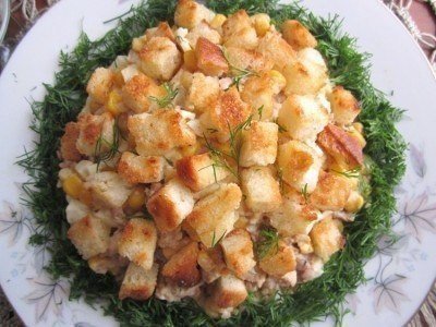 Описание: Салат из печени трески с гренкамиИнгредиенты:-1 банка печени трески (без масла),-2 варёных яйца (3 шт тоже салат не испортят, зависит от размера),-1 банка кукурузы (небольшая, вес нетто 170 г),-совсем немного майонеза (~1-2 ст.л.),-3-4-5 кусков белого хлеба для гренок , я всегда делаю с запасом (только собственное приготовление гарантирует необычный вкус этого салата),-зелёный лук , по вкусу (я сегодня не клала, забыла купить),-зелень укропа или петрушки для украшения, можно и салатные листья для подложки салата.Приготовление:1. Приготовление гренок:(для меня очень важно приготовить свои гренки, я никогда не использую покупные) :Белый хлеб (корки снять) нарезать кубиками ~1 х 1 см , если он очень свежий, то обсушить без масла в сковороде или духовке ~ 5 минут (я обычно в сковороде) , затем слегка обжарить на сливочном или растительном масле или в их смеси.Сначала подготовить масло (растопить и нагреть сковороду) , потом бросить туда подсушенные гренки и сразу постоянно мешать их, чтобы масло не попало на одну сторону, чтобы гренки были равномерно румяненькие.2. Приготовление салата:С печени трески слить масло, размять вилкой, добавить измельчённые яйца, кукурузу и майонез.Всё размешать, выложить на салатные листья (можно без них).3. Только перед самым употреблением выложить сверху гренки (можно обложить ими всю поверхность салата, а можно россыпью, тогда остальные гренки положить в вазочку, для желающих добавить их), украсить зеленью укропа.