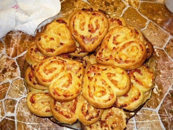 Описание: Печенье для любимого))Такое печенье подойдет не только к чаю или к кофе,но и к пиву))Слоеное тесто раскатать,сверху-мелко порезаную ветчину,поверх ветчины-потертый сыр.Скатать в рулет(с двух сторон,см.1-ый коммент),порезать на кусочки,толщиной 0,5-0,7ммПридать форму сердечек,испечь в духовке.