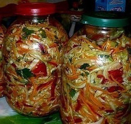Описание: Салат из свежей белокочанной капусты БЕЗ закрутки!Этот салат — упрощенный вариант нескольких рецептов консервирования капусты. Если у вас есть кухонный комбайн с функцией нарезки, на приготовления этого салата из свежей белокочанной капусты уйдет от силы полчаса. Хранится он 3-5 месяцев в холодильнике, вкусовых качеств не теряет!Ингредиенты:- 7 кг капусты,- по 3 кг моркови и сладкого болгарского перца разного цвета,- 1,5 кг репчатого лука,- 0,5 литра растительного масла без запаха(перекалить),- рюмочка уксусной эссенции 70%,- 150 г горького перца, соль по вкусу.Все овощи нарезать соломкой (используйте технику!), хорошенько перемешать с маслом и уксусом, разложить в банки и закрыть полиэтиленовыми («капроновыми») крышками. Хранить в холодильнике. Доставайте и угощайтесь!По поводу уксусной эссенции — использовать можно обычный 9% уксус, пойдет его на это количество овощей чуть меньше стакана. Я всегда пробую на вкус когда смешиваю овощи, чтоб было немного кисленько. Перелить нельзя — кислятину не съешь, не долить можно — хранится в холодильнике салатик отменно!