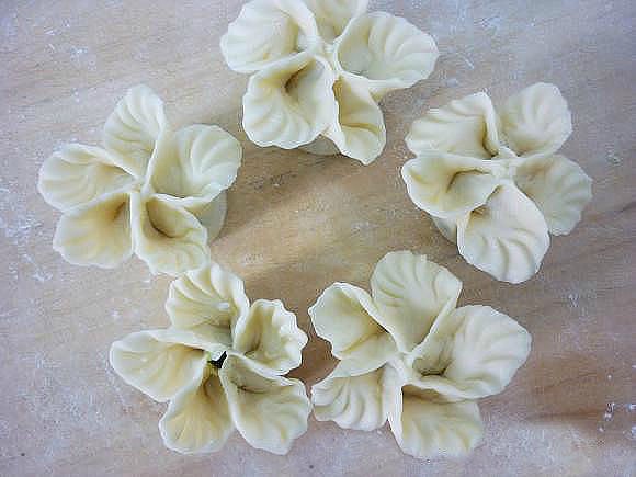Описание: ПЕЛЬМЕНИ "БУКЕТ ЦВЕТОВ" Вот вашему вниманию пельмешекцветочек... надеюсь не останетесьравнодушны... начинка может быть любой какобычной пельменной, так и сладкой...на фото овощная... Ингридиенты: мука - 200 гр. вода - 100 гр(кипяток) овощи или фарш соль, перец для теста : смешать 200 гр. муки со 100 гр.кипятка, и замесить крутоеэластичное тесто (это нужно чтобытесто было менее тянущимся, с нимбудет удобнее работать, не будутрваться пельмени... ) дать немного постоять и раскатывать лепешки. на фото грибы, зелень, побегибамбука, немного куриногорубленного фарша (вы делайте начинку котораянравится вам) если будетвозможность купить кунжутноемасло, купите обязательно, онопридает просто неповторимый вкуссалатам... а овощной начинке в пельменях добавляет изюминку...если его нет это совсем не страшно ..можно оливковое или пару капельобычного, но имейте в видукунжутное хоть и дорогое масло, ностоит того... тесто раскатать по лепешечкам исформировать так сказать звезду... красиво защипываем концы звезд ивнимание каждый лепестокподгибаем, и другой конец кончиказажимаем у основания.. чтобыобразовался лепесток, соединитьлепестки между собой.. и хорошо зажать серединку...Вот и получился цветочек....И разве это не букет цветов???отправляем в пароварку!!! Угощайтесь!!!