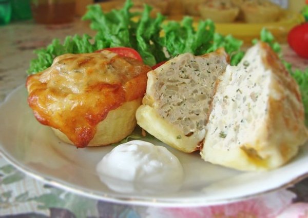Описание: Ингредиенты: 4 средние картофелины отварить 250 г куриного фарша 1 небольшая луковица 2 яйца 30 г сливочного масла 2 ст\л муки растительное масло 100 г сыра натереть на крупной терке 2 ст\л с горкой отварного риса соль, перец и любимые приправы по вкусуПриготовление: 1. Картофель смять в пюре, добавить мягкое сливочное масло, 1 яйцо, 50 г натертого сыра, соль. 2. Лук мелко измельчить и обжарить до золотистого цвета на растительном масле. 3. В фарш добавить лук, рис, яйцо, соль, перец и перемешать. Можно добавить свежую зелень или любимые травы по вкусу. 4. Картофельное пюре распределить по формочкам для кексов. У меня силиконовые, я их смазала растительным маслом. 5. В центр выложить фарш с горкой. 6. Посыпать оставшимся тертым сыром и выпекать 40 минут при t190 градусах. Готовые корзиночки надо остудить немного, чтобы пюре схватилось.