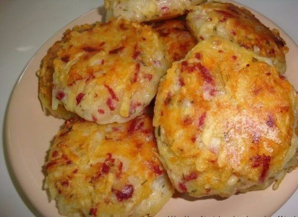 Описание: Ингредиенты: 6 картофелин 1 луковица 200 гр. ветчины 200 гр. твердого сыра 2 яйца укроп 4 ст.л. муки соль перец масло растительноеПриготовление:1. Лук, ветчину, картофель и сыр натереть на крупной тёрке. 2. Добавить яйца, муку, измельчённый укроп. Посолить. Поперчить. Хорошо перемешать. 3. Выложить массу на сковороду с помощью ложки, придавая ей форму лепёшки. 4. Обжарить с двух сторон до золотистой корочки.