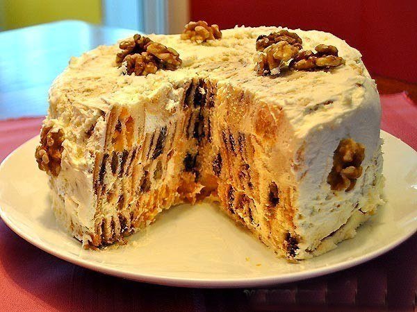 Описание: Торт «Трухлявый пень»4248238_9 (600x450, 69Kb)Ингредиенты:1 стакан сметаны2/3 стакана сахара1 яйцо0.5 ч. ложки соды (погасить)3 стакана мукиНачинка:100 гр чернослива150 гр кураги100 гр орехов150 гр изюмаКрем:750 мл сметаны1 ст. сахараНачинку для торта можно приготовить заранее: залить сухофрукты горячей водой и распарить их. Затем перекрутить орехи и сухофрукты на мясорубке по отдельности. Я перекручивала на комбайне, так быстрее. Если фруктовые смеси получились густыми, можно добавить горячей воды, хорошо размешать и сделать как повидло. Я перемешала орехи с черносливом.Для теста перемешиваем яйцо с сахаром и сметаной, добавляем соду и муку. Тесто должно получится мягкое, но не прилипать к рукам. Делим тесто на 8 колобков. Из каждого колобка раскатываем лепешку, намазываем ее черносливом и делаем рулет. С черносливом 2 рулетика, а с курагой и изюмом по 3. Печем рулетики при 180С до золотистого цвета. Остужаем у разрезаем на кусочки.Взбиваем сметану с сахаром. Теперь берем глубокую чашку или форму со съемным дном, выстилаем пленкой, намазываем пленку кремом и слоями кладем нарезанные рулетики, заливая каждый слой кремом. Ставим на ночь в холодильник. Утром переворачиваем форму и получается такая красота.Приятного аппетита!