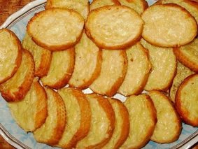 Описание: СЫРНЫЕ ГРЕНКИ К ПИВУ ИнгредиентыБелый батон — 1 ШтукаМасло сливочное — 100ГраммСыр — 100 ГраммЧеснок — 3-4 ЗубчиковРастительное масло — 100МиллилитровПроцесс приготовления1. Нарезать батон ломтикамитолщиной около 1 см. 2.Обжарить на растительноммасле ломтики батона содной стороны. 3. Натеретьсыр на терке. 4. Чеснокочистить и измельчитьчеснокодавкой или натеретьна мелкой терке. 5. Смешатьразмягченное сливочноемасло, сыр и чеснок. Можнодобавить 1-2 щепоткимолотого перца. 6. Смазатьполучившейся смесьюнеобжареную сторонугренок и выложить их напротивень. 7. Запечь вразогретой до 200 градусовдуховке минут 15-20.