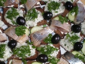 Описание: БУТЕРБРОДЫ С САЛОМ ИнгредиентыКирпичик черного хлеба — 1ШтукаСало — 150 ГраммЧеснок — 5 ЗубчиковСеледка — 1 ШтукаОгурец — 1 ШтукаМайонез — 150 ГраммСвежая петрушка, укроп — -По вкусуОливки или маслины — - Повкусу (для украшения)Процесс приготовленияПодготовим все, что нампотребуется дляприготовления бутербродов.Сало необходимопропустить через мясорубкувместе с чесноком. Затем всмесь добавить мелконарубленный укроп. Хлебнарезаем ломтиками, затемкаждый ломтик делим на 4части. Половину (подселедку) смазываеммайонезом, кусочки подсало - оставляемнетронутыми. На хлеб безмайонеза намазываем смесьиз сала и чеснока, на хлеб смайонезом выкладываемогурчики и кусочек селедкии веточку укропа.Складываем в шахматномпорядке на тарелкебутерброды, украшаеммаслинами.