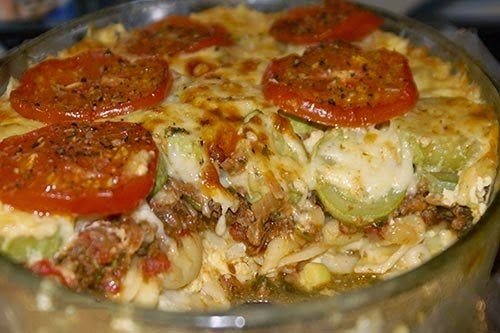 Описание: Ленивая лазаньяВкусный, сытный и быстрый ужин. Соус как в настоящей лазанье, но вместо листов — макароны.И н г р е д и е н т ыфарш мясной 0,5 кг.лук 2 шт.томатный соус 1 стакан (или свежие помидоры)макароны любые 200 гр.кабачки 3 маленькихсыр любой 150 гр.яйцо 1 шт.молоко или сметана 0,5 стаканапомидор 1 шт.соль, перец, зеленьОтварить макароны до полуготовности. Пока варятся макароны обжарить фарш с луком (обжаривать лучше сырой, так сочнее и вкуснее), добавить в фарш томатный соус, зелень, посолить, поперчить.Кабачки нарезать кольцами толщиной 1 см, посолить и слегка припустить в сковороде без масла.Макароны смешать с половиной натертого сыра и выложить в смазанную маслом форму. Сверху положить слой фарша, потом выложить кружочки кабачка.Яйцо взбить с молоком, залить все этой смесью, посыпать сверху оставшимся сыром и положить кружочки помидора. Форму поставить в рукав для запекания.Разогреть духовку до 200°С. Запекать до золотистой корочки 35 минут.