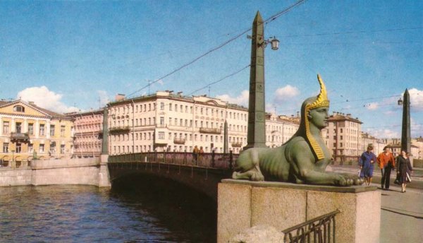 Описание: Про этот мост говорят, что он был в 'отпуске' 50 лет. Первый Египетский мост, построенный в 1826 году, был цепной, висячий, однопролётный. Его оформили в египетском вкусе, въезды украсили бронзовыми сфинксами, отлитыми по моделям скульптора П.П.Соколова. В январе 1905 года, когда по мосту проходил эскадрон кавалерии одновременно с обозом ломовых извозчиков, мост раскачался и обрушился. Эту аварию пытались объяснить ритмичными ударами конских копыт. Но такое несостоятельное объяснение отвергнуто (лошади в ногу не ходят). Причиной аварии (с человеческими жертвами) .Спустя полвека, в 1955 году, на оси Лермонтовского проспекта был сооружён новый Египетский мост, стальной, однопролётный. Авторы проекта В. В. Демченко, П. А. Арешев и В. С. Васильковский использовали сохранившихся от прежнего моста бронзовых сфинксов работы скульптора П. П. Соколова, установив их на гранитных пьедесталах. Мост украшен также чугунными обелиcками с фонарями на кронштейнах, решётками художественного литья, розетками и другим декором. Длина Египетского моста 44 метра, ширина 27 метров.