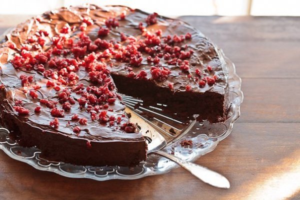 Описание: Шоколадный торт без муки с клюквой Ингредиенты:130 г сливочного масла200 г горького шоколада4 белка4 желтка130 г сахара-песка140 молотого фундука2 столовых ложки какао-порошка0,5 чайной ложки соли150 свежей клюквыГлазурь:80 г горького шоколада1 столовая ложка сливочного масла40 г сушеной клюквы (мелко нарежьте или порубите)Приготовление:Духовку нагрейте до 200 C, круглую форму для торта диаметров в 24 см смажьте сливочным маслом.Шоколад и сливочное масло растопите на водяной бане или в микроволновой печи, остудите.Желтки взбейте с сахаром до бледно-желтой смеси. Добавьте смесь растопленного шоколада и масла и хорошенько перемешайте. Добавьте молотые орехи, какао, соль и клюкву и перемешайте все деревянной или резиновой лопаткой.Белки взбейте до устойчивых пиков и аккуратно введите их в тесто. Перелейте тесто в приготовленную форму и выпекайте 25-30 минут. Торт сначала будет мягким и слегка жидким в середине, но затем затвердеет.Для глазури растопите шоколад со сливочным маслом и равномерно нанесите эту смесь на остывший торт, присыпьте сушеной клюквой и подавайте к столу.