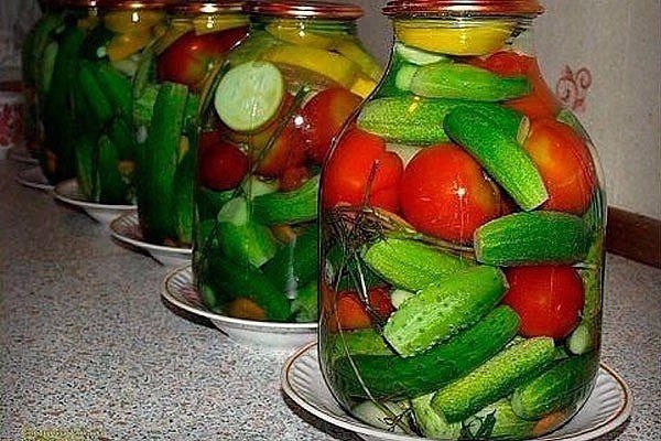 Описание: ОВОЩНОЕ АССОРТИ С ВОДКОЙБЕЗ СТЕРИЛИЗАЦИИИнгредиенты:по 50 мл водки и уксуса 9%6 листов лавровых4-5 зубчиков чеснокапо 4 гвоздики, перцадушистого и черногогорошкомпо 2 листика вишни, хрена изонтика укропапо 2 ст.л. сахара и соли1 ч.л. кориандраогурцы, помидоры, кабачки -сколько поместится втрехлитровую банкуПриготовление:В промытые и выдержанныев духовке (илимикроволновке) банкивыложить чистые сухиеовощи, чередуя.Предварительно на днобанок нужно выложитьполовину специй, разрезавзубчики чеснока на 3-4части. Сверху на огурцы спомидорами выложитькабачок и оставшиесяспеции. Залить в банкикипящую воду, накрытьстерилизованнымикрышками, на 10 миноставить, затем кипятокслить обратно в кастрюлю(удобнее это делать, надевна банку крышку сотверстиями). В водувсыпать сахар и соль,довести до кипения,добавить водку и уксус, ещераз довести до кипения,залить овощи в банках этиммаринадом, закататькрышками. Вверх дномперевернуть банки и доследующего дня оставить,укутав одеялом, затемпоставить на хранение влюбое место.