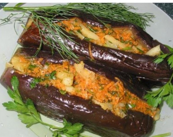 Описание: Баклажаны фаршированные квашеныеСтанут вашей любимой заготовкой.Употребляют баклажаны фаршированные квашеные с добавлением репчатого лука и растительного масла. Попробуйте обязательно!Баклажаны (самые свежие) 3кгМорковь 4 5 шт (крупных)Лук 4 крупныхЗелень сельдерея и петрушки по одному пучкуЧеснок 1 зубчик на один баклажанСольРастительное масло для обжаркиПриготовление -:1.Баклажаны вымыть, разрезать вдоль, не дорезая до краёв 2см. Отварить в солёной воде из расчёта 1 ст. л. на 1 литр воды в течении 7 минут.Оставить на 6-7 часов под наклонный пресс, можно на ночь в умывальнике.2.Приготовить начинку для фаршировки баклажан. Морковь крупно натереть, лук порезать полукольцами, обжарить отдельно на растительном масле, затем смешать, добавить мелко нарезанный чеснок и зелень сельдерея. Присолить.3.Баклажаны изнутри слегка протереть солью.4.Заполнить прорези баклажан начинкой из расчёта 1 ст. л. на один баклажан вполне достаточно.5. Уложить баклажаны плотно в кастрюлю, пересыпая каждый слой зеленью петрушки и слегка присаливая.6.Залить сверху не до самого края рассолом: на л воды -1/2 ст. л. соли.7.Поверх баклажан поставить тарелку с прессом, например: небольшая банка или кастрюля с водой. Выдержать 2-3 дня в зависимости от комнатной температуры.Баклажаны фаршированные квашеные готовы! Переложить баклажаны в банку и в холод.8. При желании можно закатать. Уложить баклажаны в стерилизованные банки на 2/3, залить рассолом из кастрюли, а сверху на один палец растительным маслом. Поставить банку стерилизоваться в воду с температурой 40 градусов, довести воду до кипения, после кипения стерилизовать 3-хлитровеы банки 90 минут, 1 литровые 40минут. Закатать крышками. А зимой открыть полакомиться.Очень вкусные баклажаны фаршированные квашеные в салате из помидор.Приятного аппетита!
