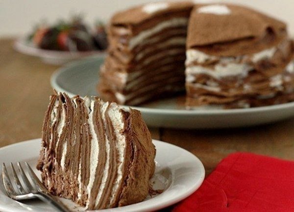 Описание: Блинный шоколадный торт назавтракИнгредиенты:Блины:Яйцо - 4 штМолоко - 1,5 стаканаВода - 1 стаканаМука - 2 стаканаКакао-порошок - 1/2 стаканаСливочное масло - 6 столовыхложекСахар - 2 столовых ложкиВанилин - 2 чайных ложкиНачинка:Взбитые сливки/ Нутелла/шоколадный мусс или что-либопо желаниюПриготовление:Все ингредиенты для блиновсмешайте в блендере и взбейтеоколо 10 секунд. Поставьте тестов холодильник на час. Наразогретой сковороде насливочном масле обжарьтетонкие блины.Выложите на тарелку ипромажьте блинные слои,чередуя шоколадную пасту вовзбитыми сливками
