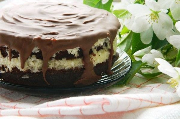 Описание: Торт "Баунти"Ингредиенты:Бисквит:●слив. масло - 250 г (комнатнойтемпературы)●сахар - 2/3 стакана●муки - 200 г●разрыхлитель - 1,5 ч.ложки●яйца - 4 шт.●молоко - 4 стол. ложки●какао - 3 стол. ложки●ванилинПриготовление:Масло взбить с сахаром.Добавлять по одному яйцу,каждый раз хорошо взбивая.По очереди добавляем остальныеингредиенты.Смазать форму и выложить тудатесто.Выпекать в разогретой духовке(180 С) 25-40 минут (доготовности)Остудить и разрезать вдоль на 2части.Я не остужала.Кокосовая начинка:-молоко - 500 мл-манная крупа - 6 стол. ложек-слив. масло - 200 г-сахар - 2/3 стакана-кокосовая стружка - 200 г(можно и больше, я всегдабольше кладу)В кастрюльку влить молоко,добавить масло и манную крупу,поставить на огонь и часто мешаявенчиком довести до кипения.Варить до загустения.Снимаем с огня. Добавляем сахари кокосовую стружку.Хорошо вымешать.======================================Сборка:В разъемную форму положитьнижний корж. Сверху выложитькокосовую начинку и плотнопримять, разровнять.Сверху положить второй корж ипоставить в холодильник на ночь.Украсить по вкусу.Я сверху намазала варенойсгущенкой, а потом полилашоколадной глазурью. И у менявсе разъехалось, растаяло.Может у вас получится...Тортик получился очень вкусными сытным. Приятного чаепития!Вот, еще раз делала этот тортик,уже сверху шоколадом не сталаполивать. Очень вкусный!На разъемную форму диаметром20-21 см.Если форма диаметром 26 смпродукты увеличить в 1,5 раза,а начинку не увеличивать, еехватит.