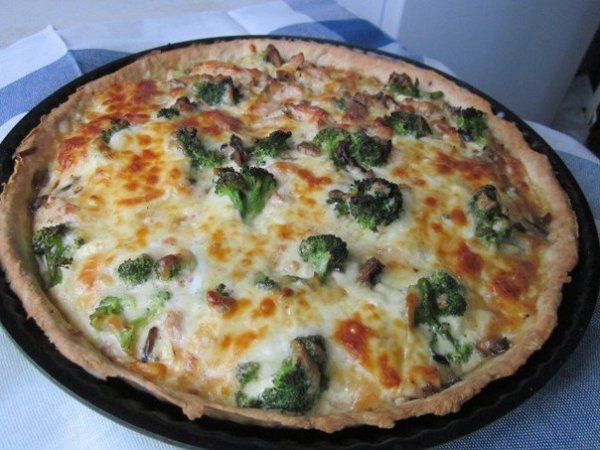 Описание: Лоранский пирог с курицей,грибами и брокколиИнгредиенты:тесто:50г. сливочного масла1 яйцо3 сл.л. холодной воды200г. муки0,5 ч.л. солиначинка:300г. куриного филе400г. грибов200г. брокколи100г. лукарастительное маслосользаливка:200 мл. сливок 25%150 г. сыра2 яйца1 ч.л. мускатного орехаПриготовление:1. Масло перемешать с яйцом.однородности массы добиватьсяне надо2. Добавить воду3. Добавить муку и соль, замеситьтесто. Завернуть тесто впищевую пленку и положить вхолодильник на 30 минут4. Готовим начинку.Куриное филе отварить иостудить.5. Мелко нарезать6. Лук мелко порезать7. Грибы порезать на небольшиекусочки8. На растительном маслеобжарить лук (у меня оливковое)9. Добавить грибы, жарить 10минут. Посолить.10. Добавить филе11. Следом добавить брокколи.Жарить 10 минут. Остудить.12. Готовим заливку.Яйца немного взбить13. Добавить сливки,перемешать.14. Сыр натереть, добавить кяичной смеси.15. Добавить мускатный орех.Перемешать. Если необходимо,посолить.16. Тесто раскатать и выложить вформу. В идеале для данногоколичества начинки нужна формадиаметром 27 см., у меня формачуть больше 30 см.17. Выложить начинку18. Выложить заливку19. Выпекать в разогретой до180* духовке 40 минут.ПРИЯТНОГО АППЕТИТА