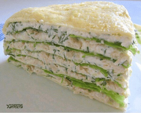 Описание: ТОРТ С КУРИНОЙ ГРУДКОЙ Ингредиенты: 10 белков, 2 желтка, 1 куриная грудка, 200 г нежирного творога, зелень, листья салата, стакана нежирного кефира, соль, перец.Приготовление:1. Смешиваем белки и желтки. На антипригарной сковороде жарим три блина из яиц. Отдельно варим грудку, слегка солим, перчим. Нарезаем грудку кубиками. 2. Смешиваем творог с зеленью и кефиром. Выкладываем в форму: сначала белковый блин, на него слой творога, курица, листья салата. Повторяем слой. 3. Закрываем все белковым блинчиком. Оставляем в холодильнике на пару часов для пропитки.Приятного аппетита!