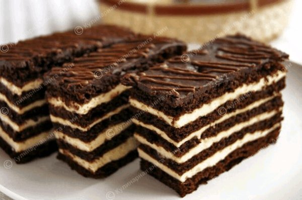 Описание: Торт "Спартак"Торт "Спартак" - это медовик с заварным кремом и шоколадными медовыми коржами. Очень вкусный тортик! И смотрится нарядно в разрезе!Вам потребуется:Крем:молоко - 500 мляйца - 3 штмука - 3 ст.л. (с горкой)крахмал - 1 ст.л.(с горкой)ванильный сахар - 1 пак.сахар - 150 гсл. масло - 150 гТесто:яйца - 1 шт.молоко - 2 ст.л.сахар - 150 гсода - 1 ч.л.мед - 3 ст.л.сл. масло - 50 гкакао - 2 ст.л.мука - 400 г (или чуть меньше)Как готовить:1. Сначала приготовим крем.Смешать в кастрюльке (с антипригарным покрытием) всё, кроме сливочного масла. Варить на медленном огне, постоянно помешивая до загустения. Остудить до комнатной температуры2. Готовим тесто:В кастрюльке (с антипригарным покрытием) смешиваем всё, кроме муки. Варим на медленном огне до увеличения массы 10-15 минут. Снять с огня и добавить 2 ложки какао. Размешать.Добавить всю муку, перемешать. Тесто начала будет слишком мягким. Даем ему остыть (минут 20-30) и оно станет тверже.3. Разделить тесто на 5 частей. Раскатывать прямоугольники размером 20х25 см.Печь при 200 С 5 минут. Т.к. коржи темные, то не видно, когда они "подрумянятся". Поэтому пеките 5 минут, а дальше смотрите по своей духовке - или больше не надо или еще минуты 2-34. Крем:Взбить сливочное масло и добавлять понемногу крем, постоянно взбивая.5. Обмазать 4 коржа кремом. Сверху положить 5 корж и залить теплой шоколадной глазурью (у меня 100 г шоколада с 1-2 ст.л. раст. масла=растопить на водяной бане). Оставить на ночь для пропитки. Лучше будет, если вы его а пару часиков в холодильнике подержите, тогда срез будет аккуратнее...Утром обрезать края острым ножом, разрезать торт на пирожные и нанести молочным или белым шоколадом полоски.Приятного аппетита!