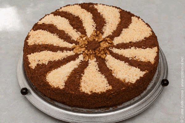 Описание: Торт "Мужской идеал"Ингредиенты:Сахарный песок 300 гЯйцо 3 шт.Мука - 600 гМед 3 ст. л.Коньяк или водка 3 ст. л.Сода 1 ч. л.Уксус 1 ст. л.Ванилин 100 гСоль - 1 щепоткаОрехи грецкие 200 гСгущенка(вареная) 1 банкаМасло сливочное 200 гПриготовление:1. Взбиваем яйца с сахарным песком до однородной смеси. Добавляем мед и размешиваем.2. Грецкие орехи измельчить и смешать с яичной смесью. Вливаем водку и перемешиваем.3. Просеиваем 1 стакан муки и размешиваем тесто. Добавляем соду, и гасим ее уксусом. Размешиваем тесто, добавляем щепотку соли и опять размешиваем.4. Добавляем ванилин и оставшуюся муку, хорошо размешиваем до однородной массы.5. Делим тесто пополам для двух коржей. Выпекать при температуре 160-180град. Пока коржи остывают самое время заняться кремом. Взбиваем вареную сгущенку с маслом, добавляем измельченные орехи и ванилин и еще раз взбиваем.6. Поместите крем минут на 10 в холодильник. Разрезаем каждый корж на две части. 7. Теперь у нас есть нужные компоненты для торта Мужской идеал. Смазываем коржи кремом и укладываем их друг на друга.8. Промазываем бока кремом и переходим к оформлению торта. Я решила много не возится и обсыпала торт измельченным печеньем. Сначала наносим рисунок крошкой темного печенья, затем затемняем бока торта, и остается добавить полосы из крошки светлого печенья.9. Торт Мужской идеал готов, дайте ему настояться и пропитаться в течение нескольких часов.