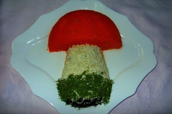 Описание: САЛАТ «ГРИБОК»ИНГРЕДИЕНТЫ:1 кг помидоров, 500 г творога, 200 г сливочного масла, 5 зубков чеснока, соль по вкусу, зелень. РЕЦЕПТ ПРИГОТОВЛЕНИЯ:Творог тщательно растереть с маслом до получения однородной массы, смешать с толчёным чесноком и хорошо посолить. Мокрыми руками разделать массу в виде конусов со срезанными верхушками – ножки грибов. Плоское блюдо посыпать мелко нарезанной зеленью, сверху поместить «ножки грибов, а на них – срезанные верхушки помидоров. На помидоры нанести белые точки из растёртого сливочного масла. До подачи на стол этот салат нужно держать на холоде.