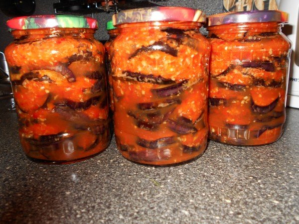 Описание: БАКЛАЖАНЫ В АДЖИКЕ.Ингредиенты:Баклажан (лучше не очень крупные) — 3 кгПомидор (зрелые,мясистые) — 3 кгПерец сладкий — 1 кгЧеснок (2 головки,я брала одну)Перец черный (горький) — 2 штСоль (обычная,я брала 2.5 ст. ложки) — 100 гСахар (в рецепте было 2 стакана,я добавила 0.5 стакана,получилось нормально)Уксус (в рецепте 100 мл. 5-ти процентного,я добавила 3 столовых ложки 9-ти процентного)Масло растительное (я добавила меньше стакана) — 1 стак.Зелень (большой пучок укроп,петрушка)РЕЦЕПТ:Помидоры, перец, баклажаны, зелень, очищенный чеснок, горький перец хорошо вымыть, дать стечь воде. Все кроме баклажан и зелени пропустить через мясорубку, перелить в посуду в которой будете варить, лучше что то с широкими краями, добавить соль, сахар, уксус, мелко порезанную зелень, масло, перемешать, довести смесь до кипения. Баклажаны порезать кольцами чуть шире пальца, не сильно тонко и не сильно толсто, так чтобы они и не разварились и в то же время не остались сырыми. Опустить порезанные баклажаны в кипящую аджику, варить на умеренном огне 20 минут, проверить на готовность баклажаны спичкой. Мешать очень аккуратно, стараясь не мять синенькие.Затем разложить все в подготовленные стерильные банки, сразу закатать стерильными крышками, перевернуть, укутать пока не остынут.