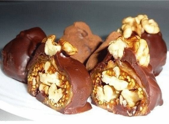Описание: НЕРЕАЛЬНО ВКУСНЫЕ ДОМАШНИЕ КОНФЕТЫИнгредиенты:Инжир сушеный 200-250 гШоколад (плитка)масло сливочное 1 ст.л.Грецкие орехиКакаоПриготовление:1.Инжир замочить не надолго в кипятке, затем остудить (можно просушить бумажным полотенцем).2.На водяной бане (или в микроволновке) растопить шоколад (лучше тёмный), можно добавить немного сливочного масла.3.У инжира на "попке" делаем надрез крест-накрест и фаршируем инжир крупно-молотыми грецкими орехами, создаем форму трюфелей, инжир мягкий и послушный в руках, затем окунаем в тёплый шоколад, аккуратно вынимаем, выкладываем на решётку.4.Когда шоколад начнет постепенно застывать, можно обвалять в какао и украсить орехом. Затем на несколько часов поместить в холодильник.Приятного аппетита